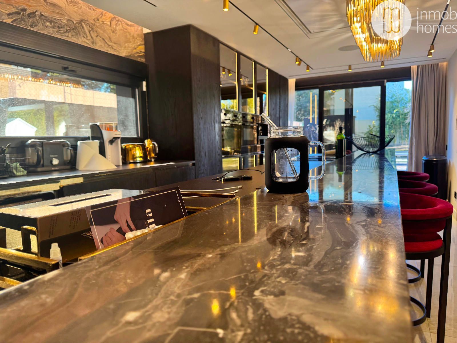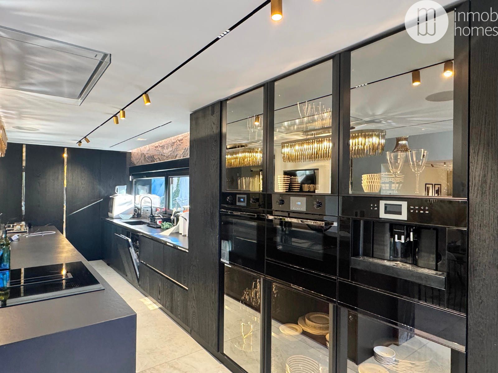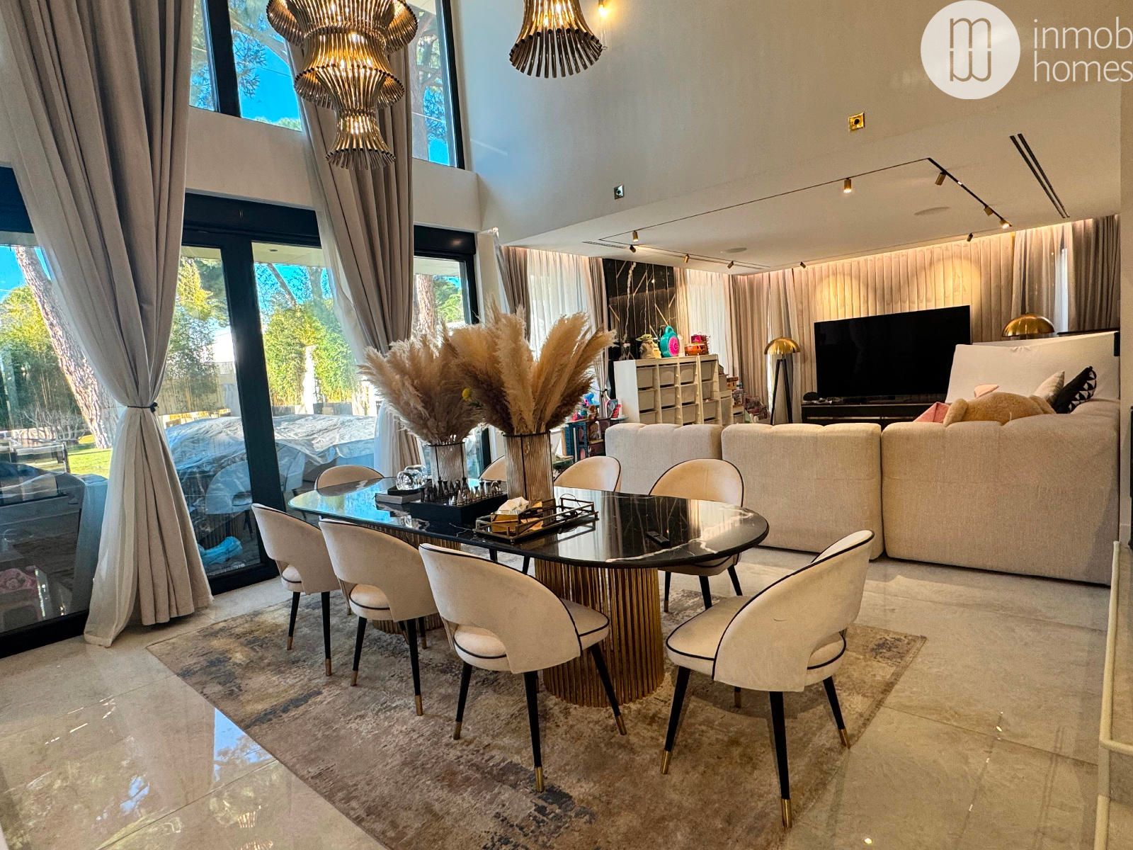 La planta principal se articula en torno a un concepto abierto, donde salón, comedor y cocina conviven en un espacio amplio y luminoso. La cocina, de estilo moderno, está equipada con electrodomésticos de última generación y una sofisticada isla central, mientras que los grandes ventanales de suelo a techo crean una conexión fluida entre el interior y el exterior.