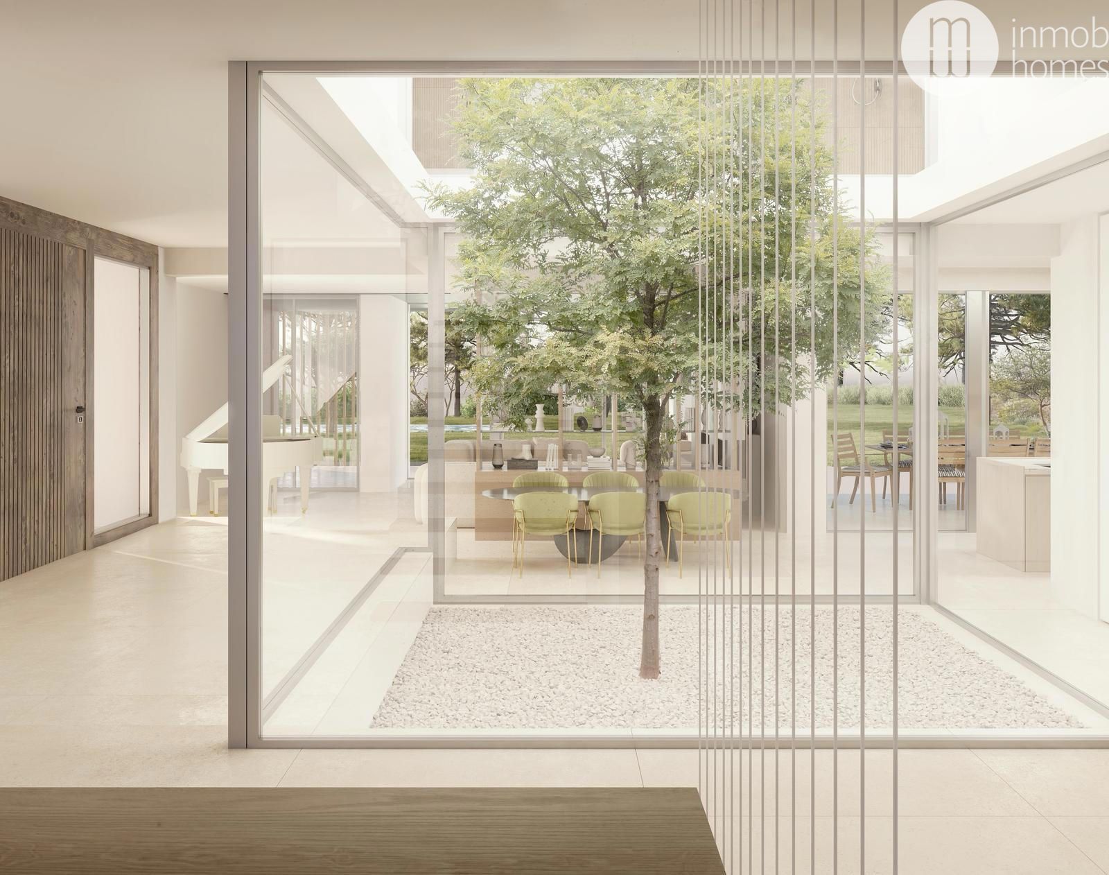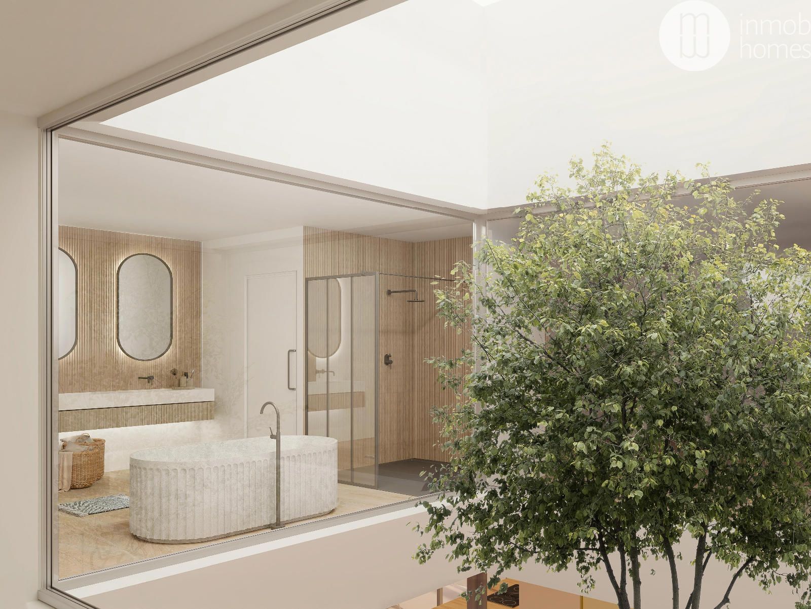 El corazón de la vivienda lo constituye un impresionante patio interior acristalado, que articula los espacios y aporta una extraordinaria entrada de luz natural, creando una conexión fluida entre estancias.