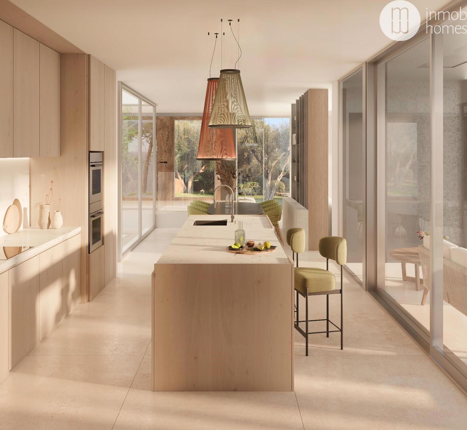 La cocina, de diseño abierto, destaca por sus grandes ventanales panorámicos de suelo a techo, que potencian la luminosidad y la integración con el entorno, con acabados de alta gama y posibilidad de personalización.