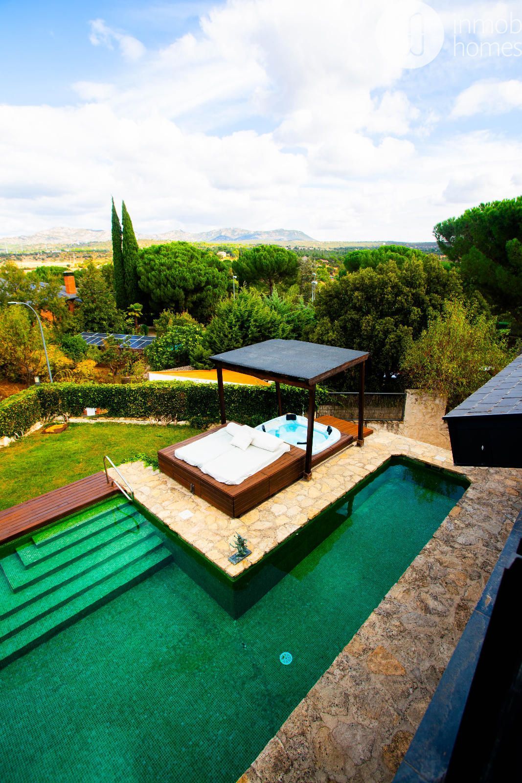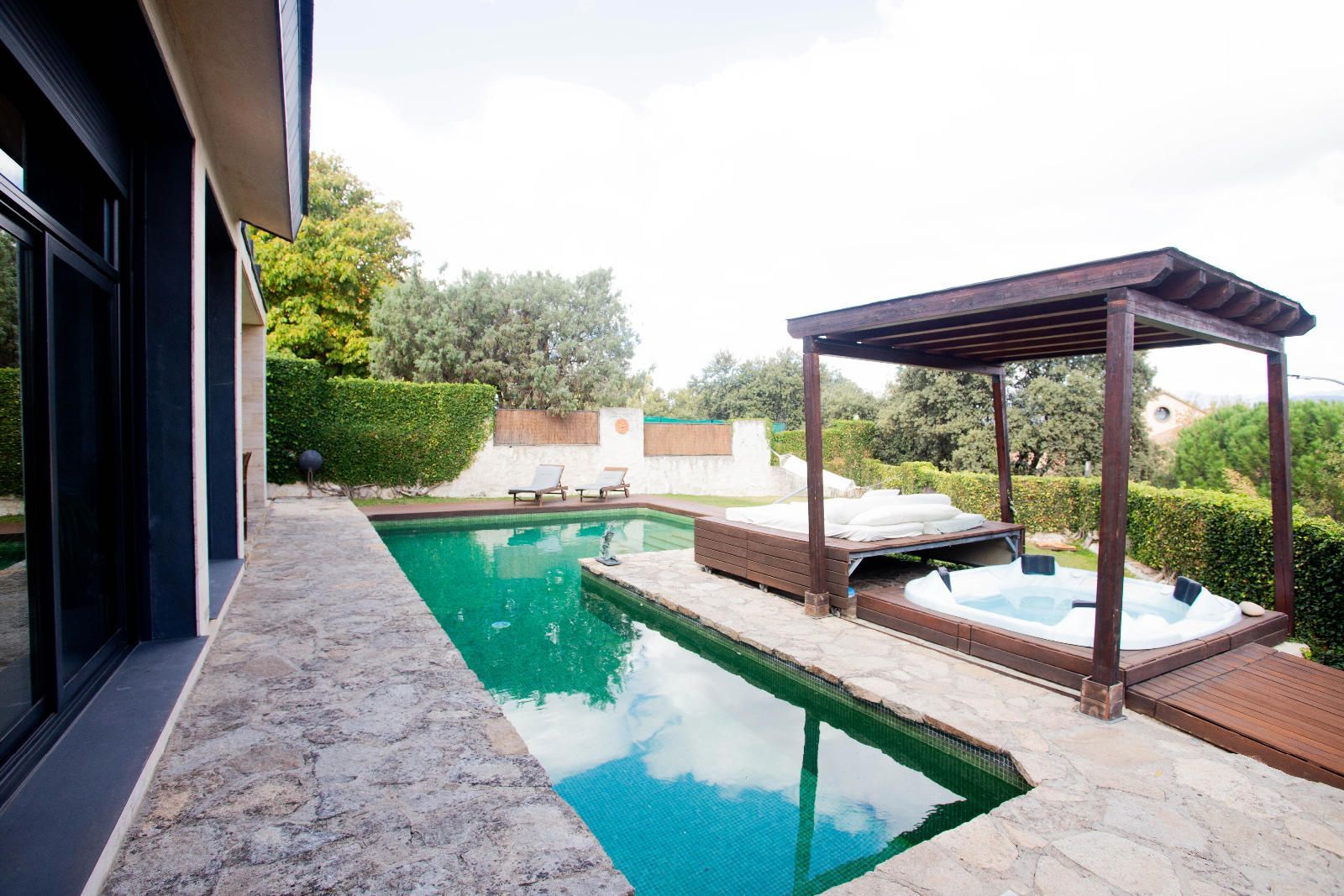 El exterior es un auténtico oasis de relajación: piscina en forma de L con jacuzzi, cama balinesa