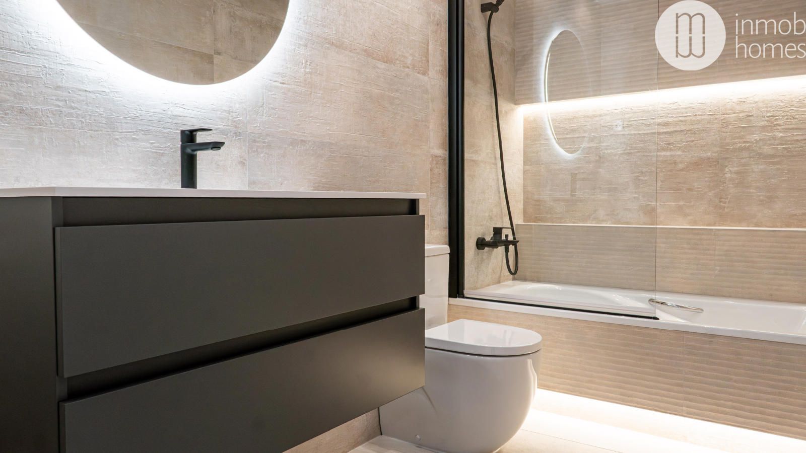 Baños totalmente alicatados según proyecto, con piezas porcelánicas rectificadas de primera calidad firma PORCELANOSA en gran formato, sanitarios ROCA, inodoros suspendidos, platos de ducha de tipo resina, grifería monocromada y termostática. Baños totalmente vestidos con lavabos decorativos de diseño,